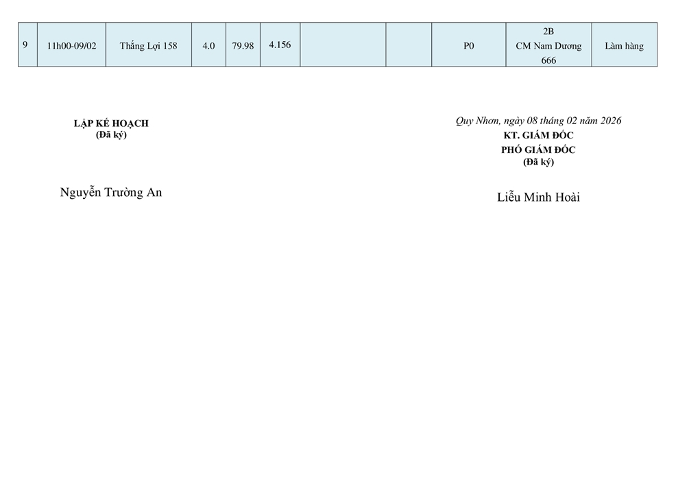 KẾ HOẠCH ĐIỀU ĐỘNG TÀU NGÀY 09/02/2026