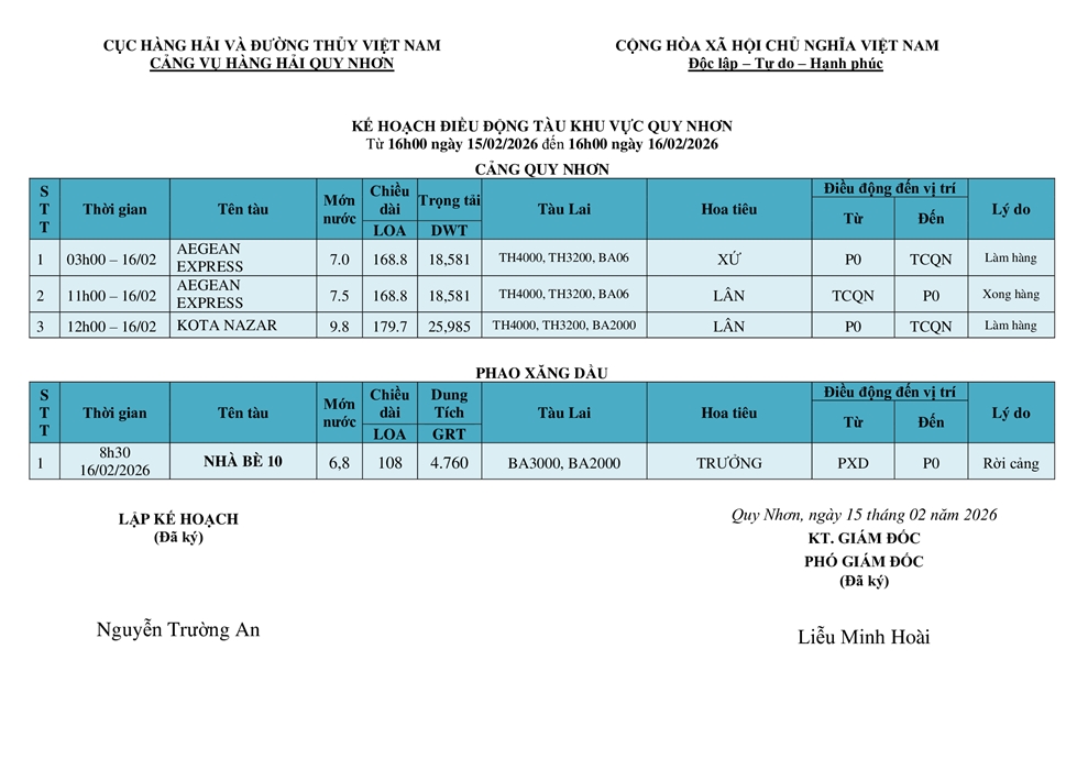 KẾ HOẠCH ĐIỀU ĐỘNG TÀU NGÀY 16/02/2026