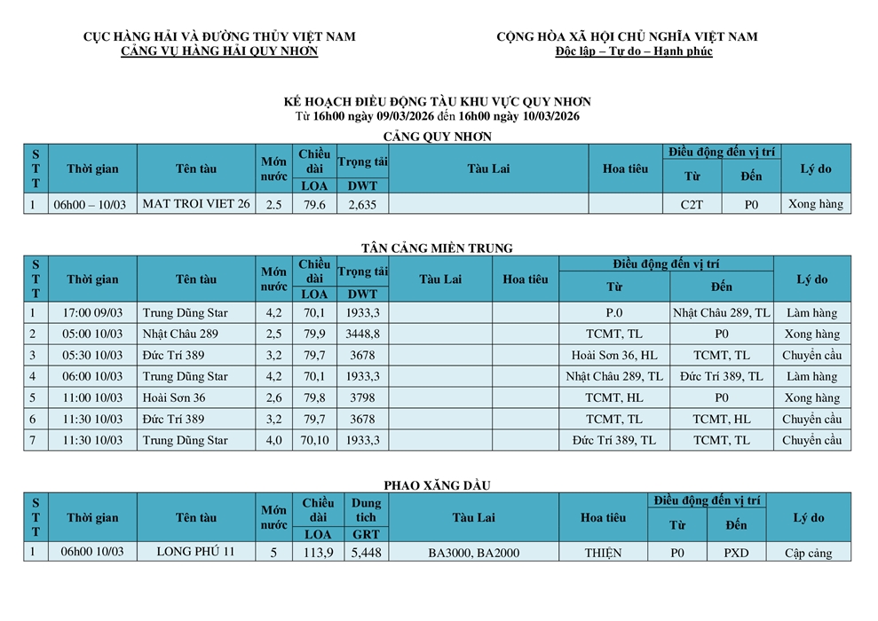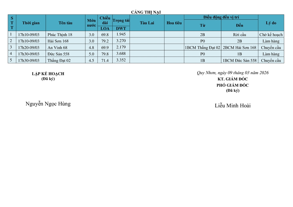 KẾ HOẠCH ĐIỀU ĐỘNG TÀU NGÀY 09/03/2026
