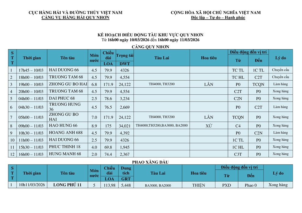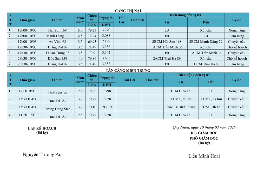 KẾ HOẠCH ĐIỀU ĐỘNG TÀU NGÀY 10/03/2026