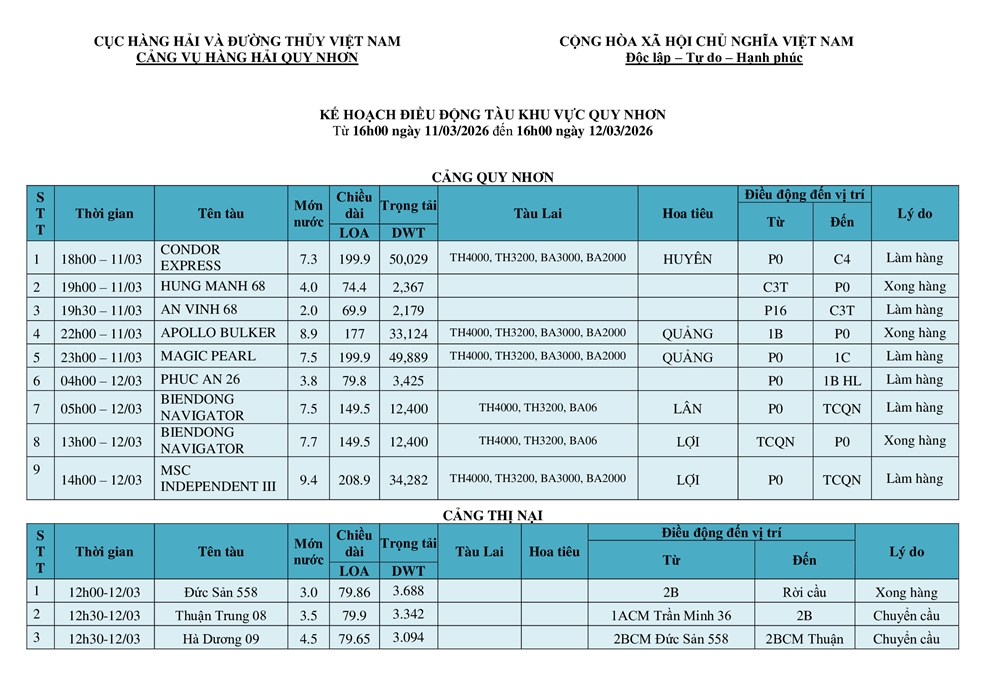 KẾ HOẠCH ĐIỀU ĐỘNG TÀU NGÀY 11/03/2026