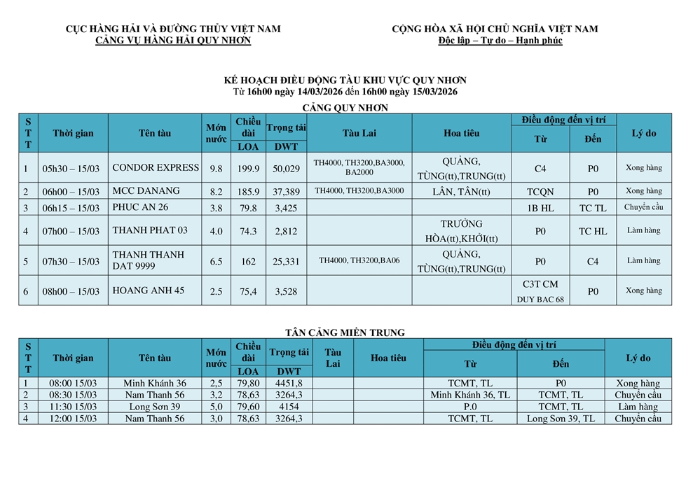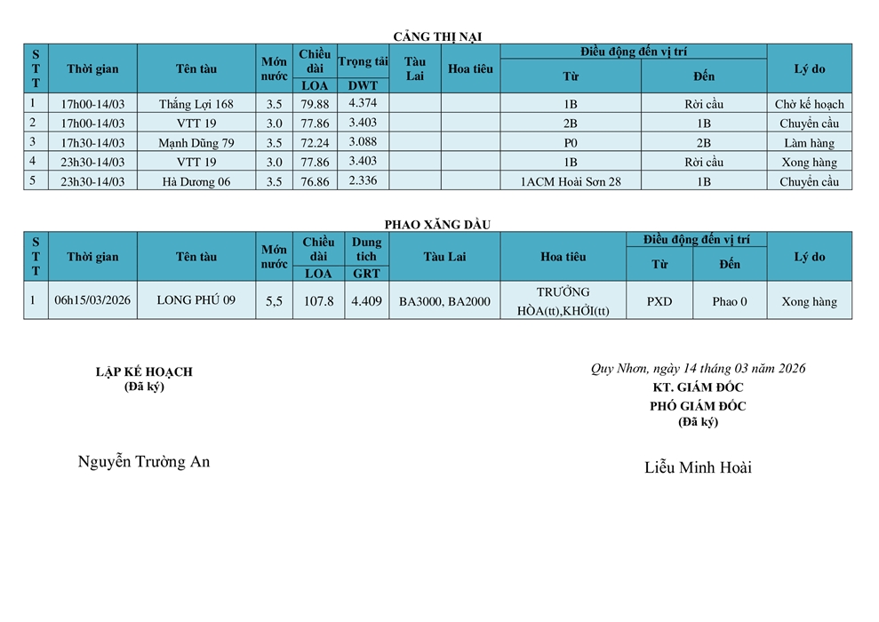 KẾ HOẠCH ĐIỀU ĐỘNG TÀU NGÀY 14/03/2026