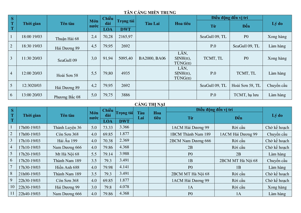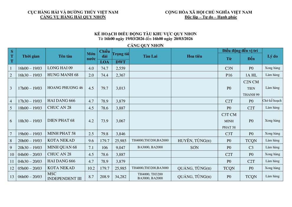 KẾ HOẠCH ĐIỀU ĐỘNG TÀU NGÀY 19/03/2026