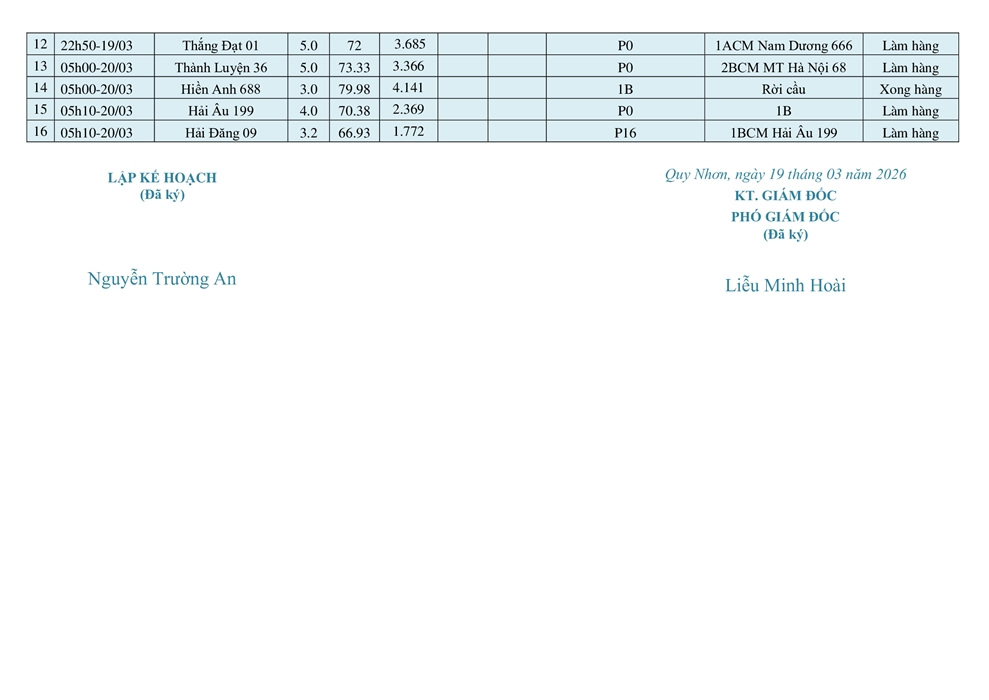 KẾ HOẠCH ĐIỀU ĐỘNG TÀU NGÀY 16/03/2026