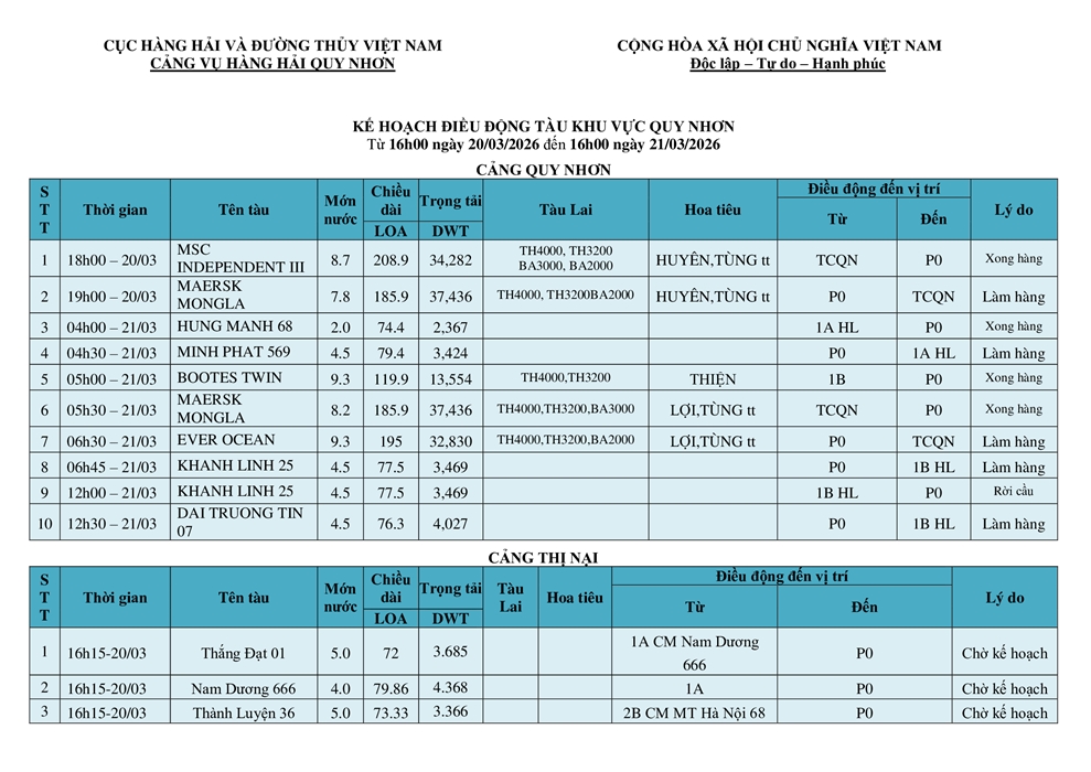 KẾ HOẠCH ĐIỀU ĐỘNG TÀU NGÀY 20/03/2026