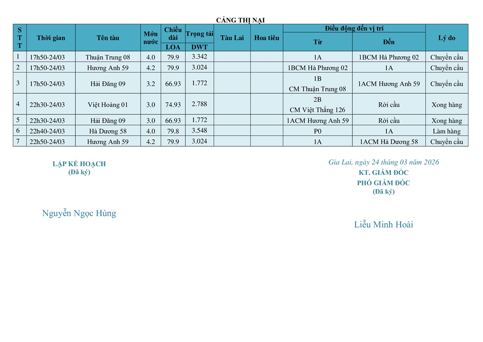 KẾ HOẠCH ĐIỀU ĐỘNG TÀU NGÀY 24/03/2026