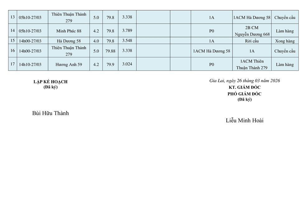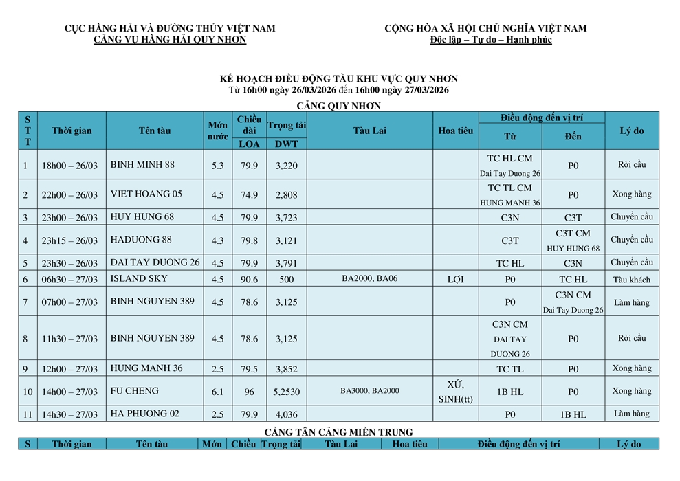 KẾ HOẠCH ĐIỀU ĐỘNG TÀU NGÀY 26/03/2026