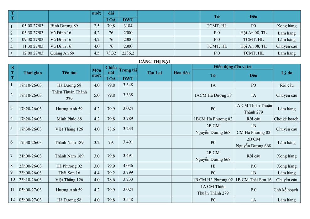KẾ HOẠCH ĐIỀU ĐỘNG TÀU NGÀY 27/03/2026
