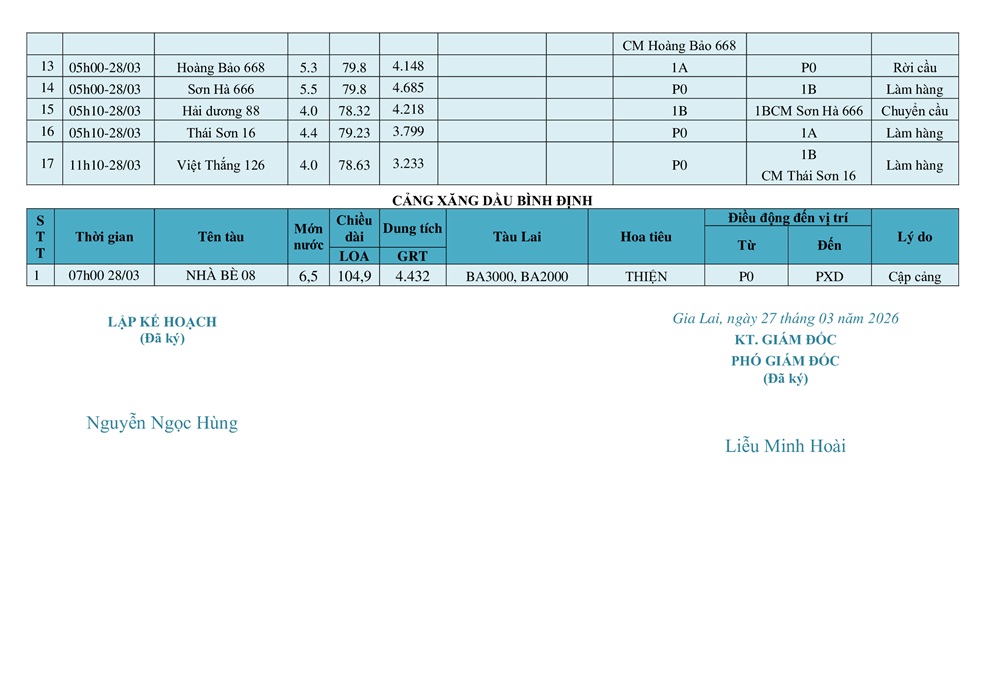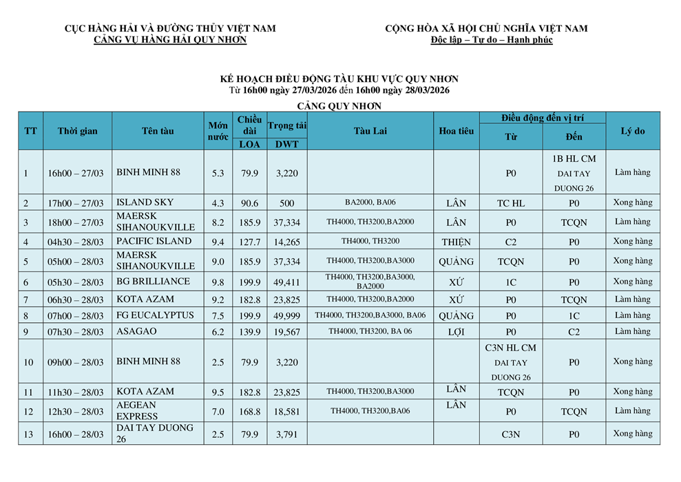 KẾ HOẠCH ĐIỀU ĐỘNG TÀU NGÀY 27/03/2026