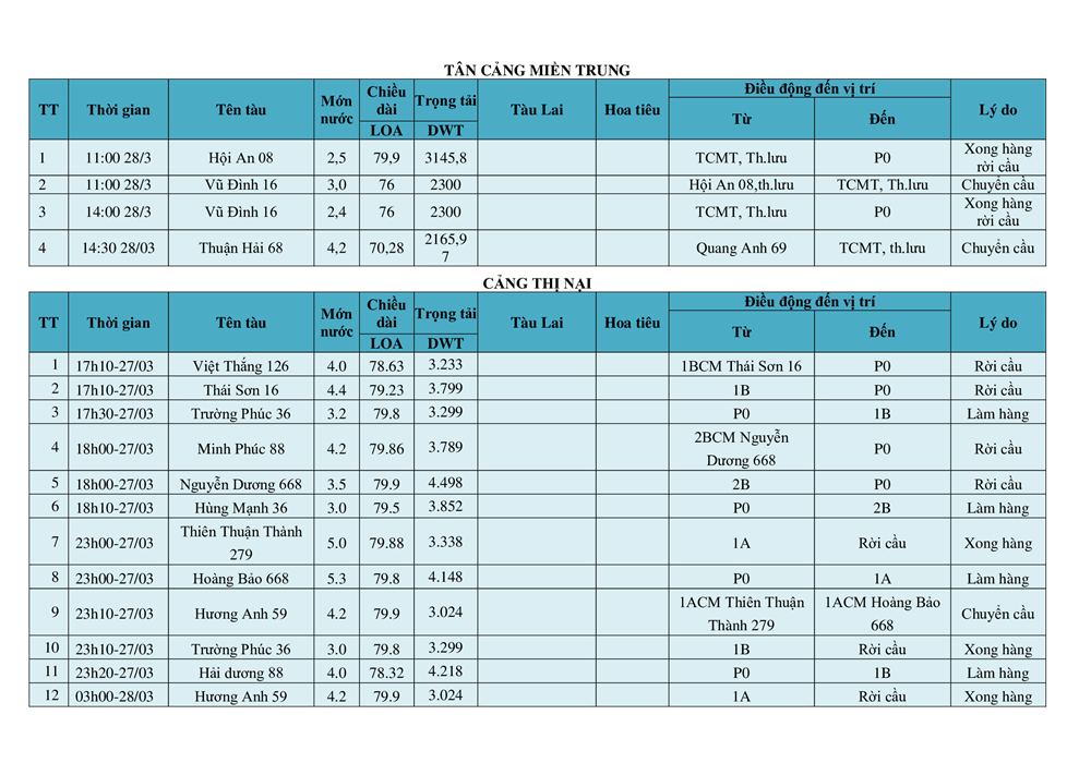 KẾ HOẠCH ĐIỀU ĐỘNG TÀU NGÀY 28/03/2026