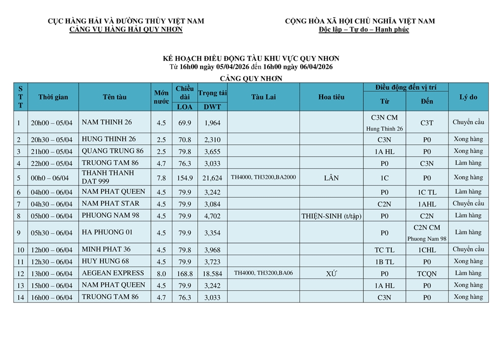 KẾ HOẠCH ĐIỀU ĐỘNG TÀU NGÀY 05/04/2026