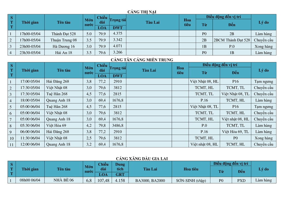 KẾ HOẠCH ĐIỀU ĐỘNG TÀU NGÀY 06/04/2026