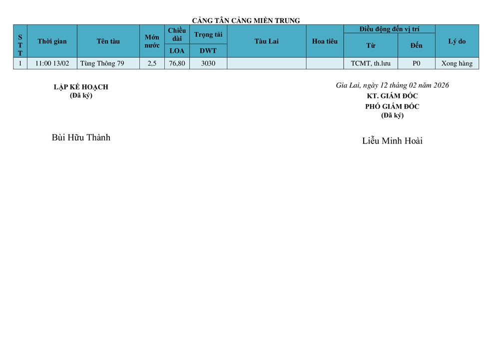 KẾ HOẠCH ĐIỀU ĐỘNG TÀU NGÀY 26/02/2026