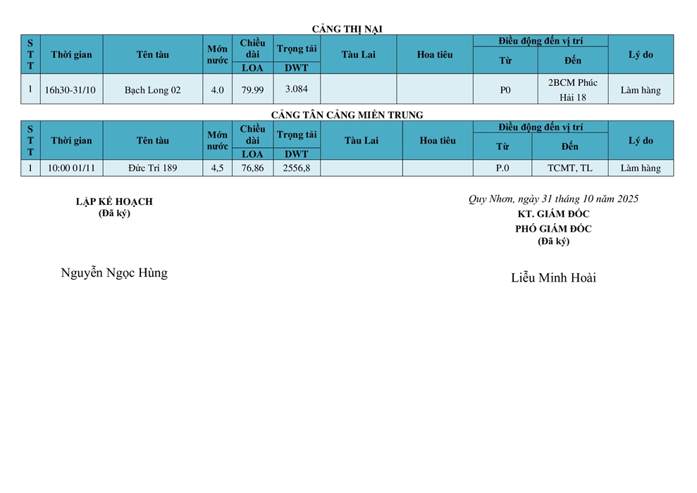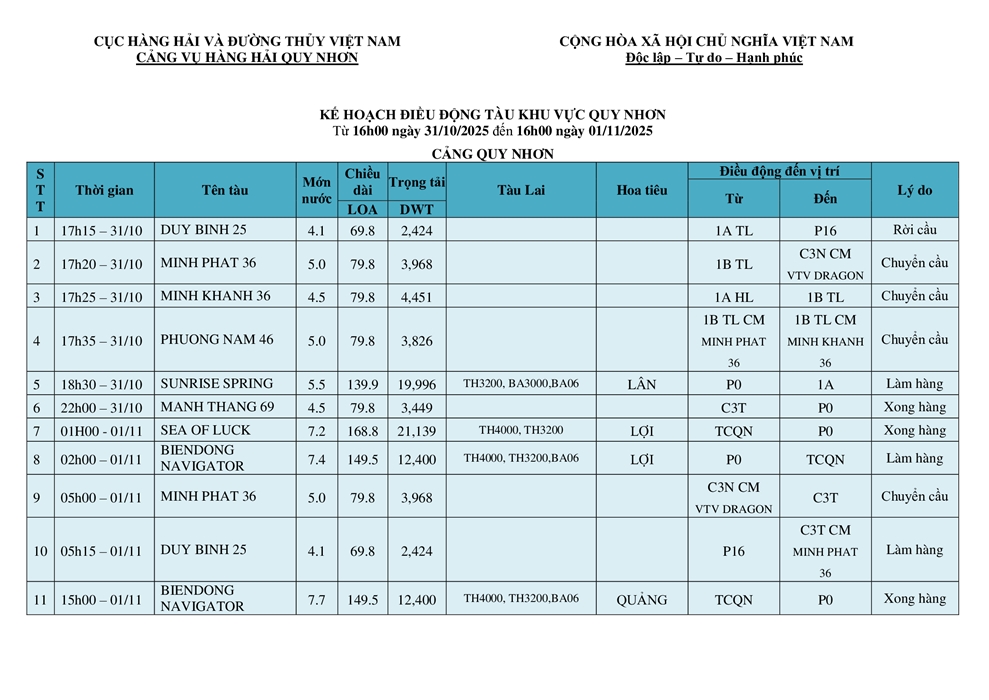 KẾ HOẠCH ĐIỀU ĐỘNG TÀU NGÀY 01/11/2025