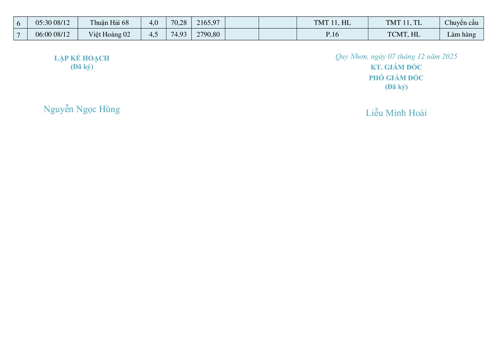 KẾ HOẠCH ĐIỀU ĐỘNG TÀU NGÀY 08/12/2025